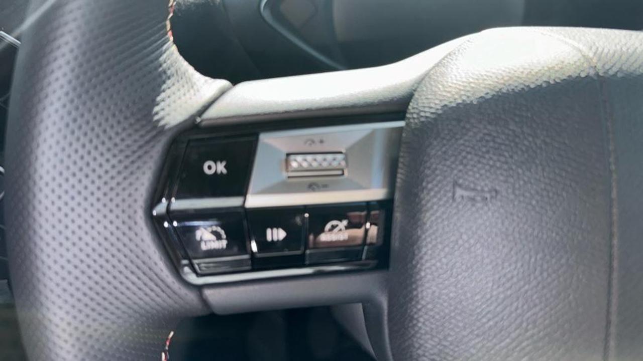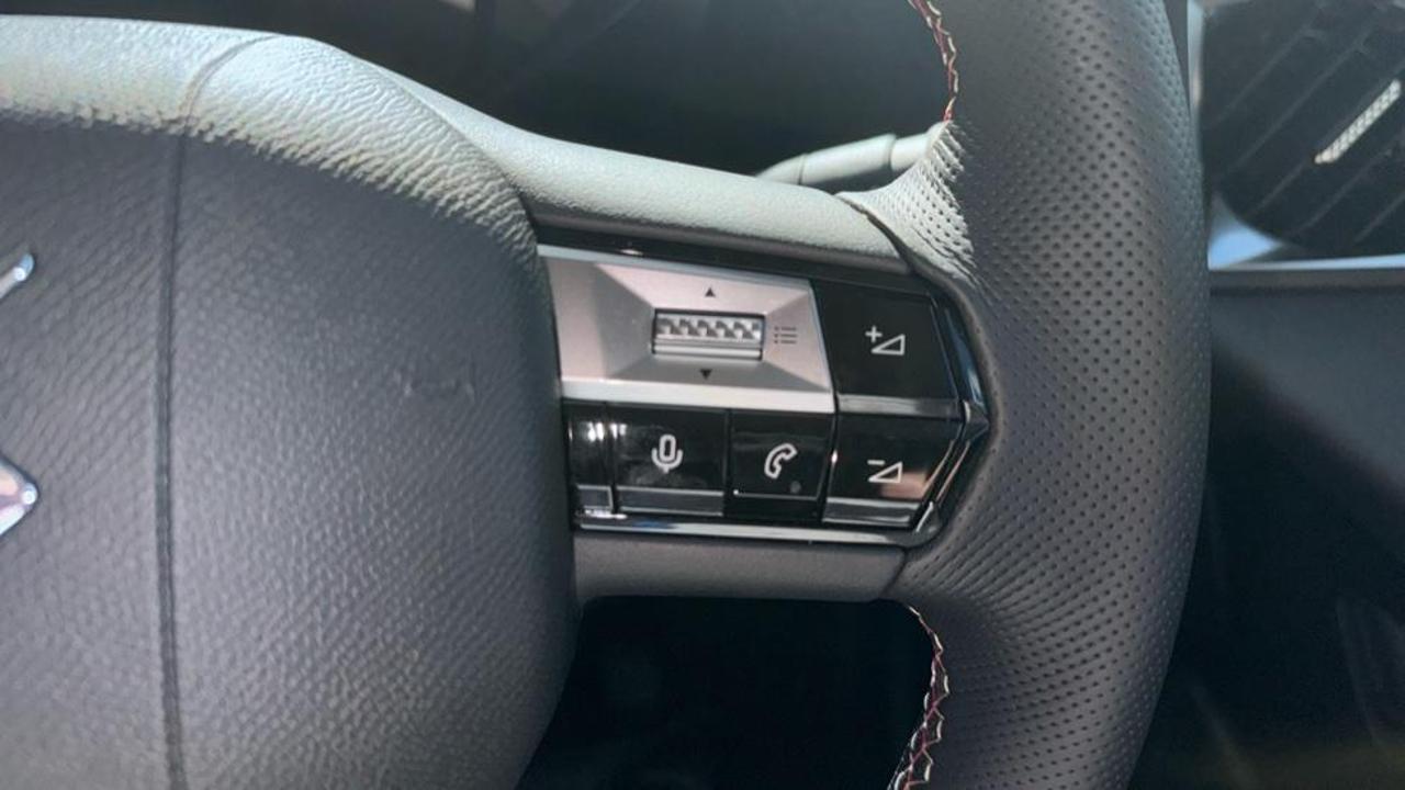 - black perforated leather steering wheel with contrast stitching